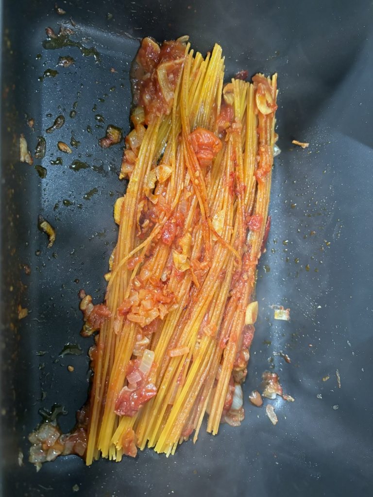 今話題になっている暗殺者のパスタを減塩バージョンで挑戦。横茹で出来るパスタ鍋を使用したのでパスタを折る必要はありませんでした。鍋一つで完成まで大丈夫。トマトペーストとトマトピューレーがないのでトマト缶で代用。オロシショウガを少々いれています。
