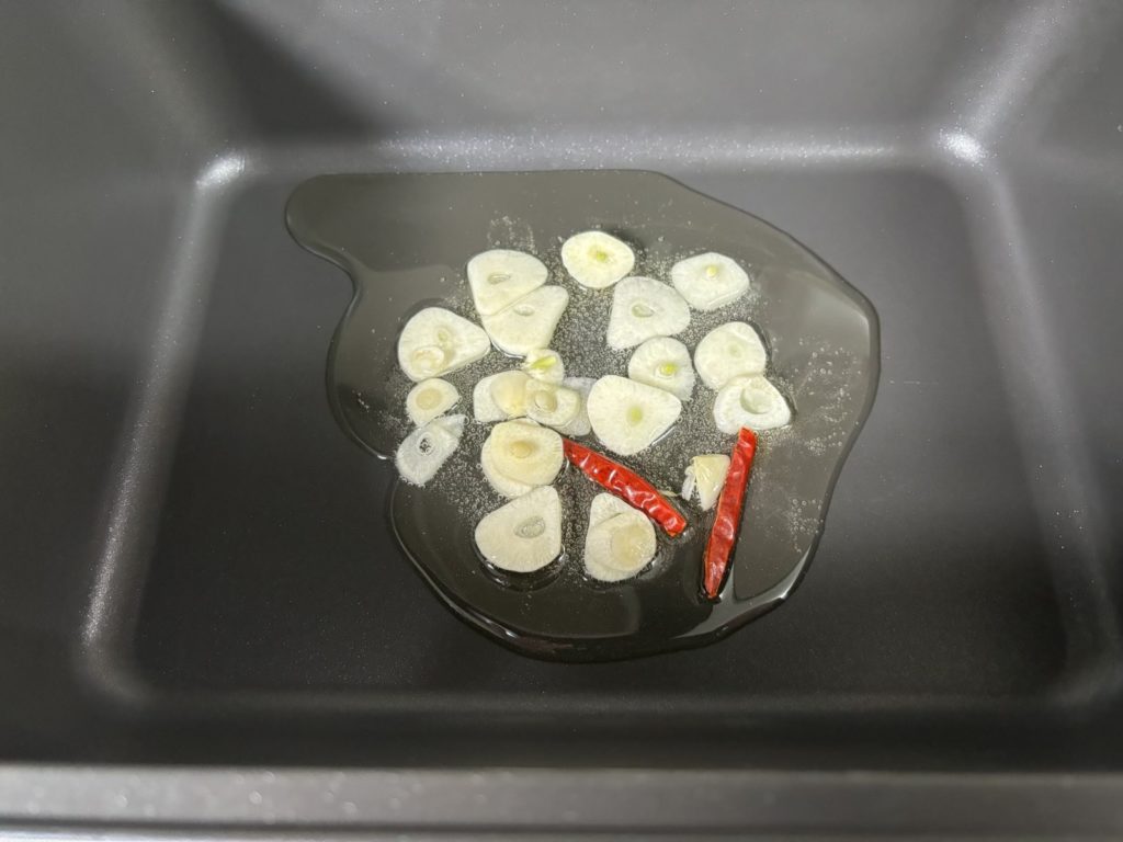 ②鍋にオリーブオイルをしいてにんにく、鷹の爪をいれて弱火にかけます。