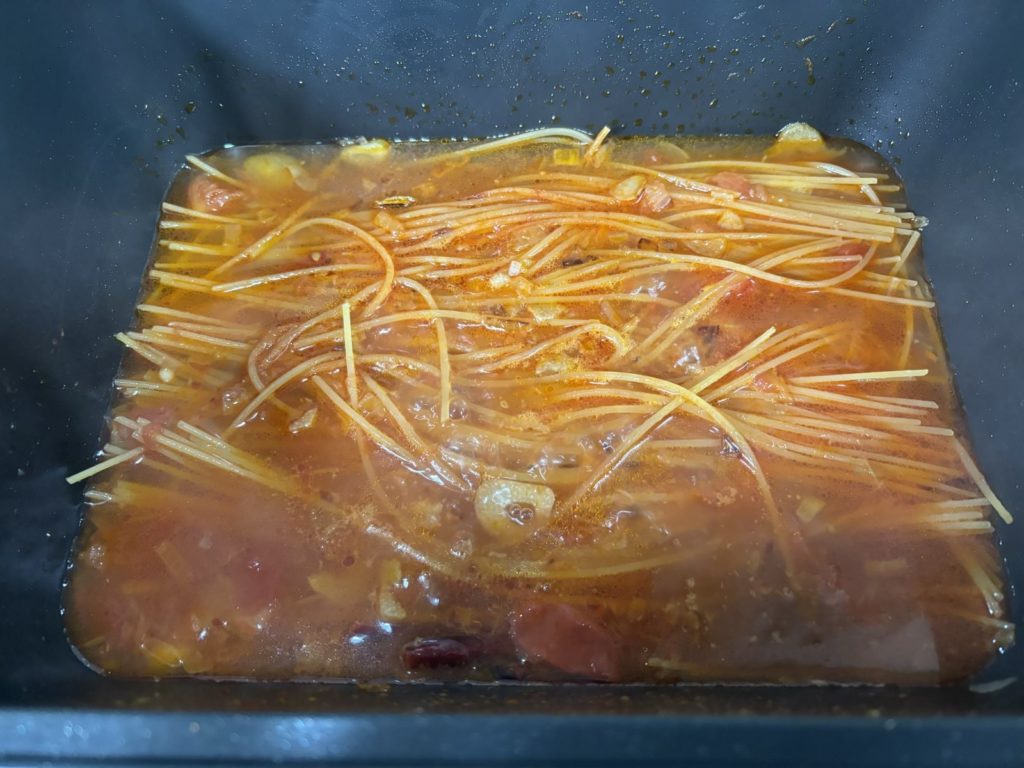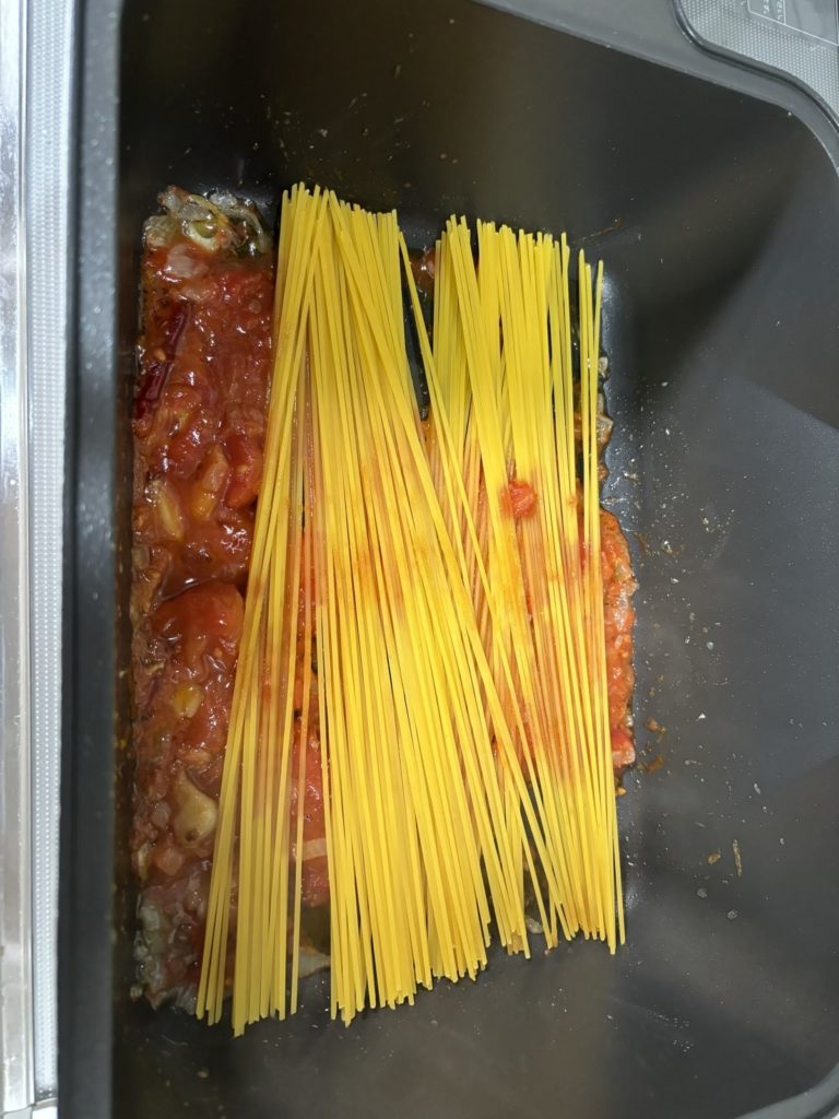 ⑤パスタを投入する。全体的に広がろように出来るだけ重ならないように中火で。
