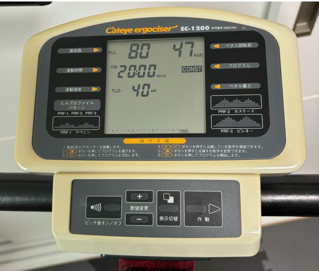 退院前日に心肺運動負荷試験を行った。その結果、心臓リハビリを行うときの適切な運動負荷量がわかった。安全に運動ができる範囲の負荷量だ。理学療法士さんから伝えられたのは「負荷量40W以下で20分以上エルゴをこぐ」だった。ただし脈拍が70回/分ぐらいを超えないこと。