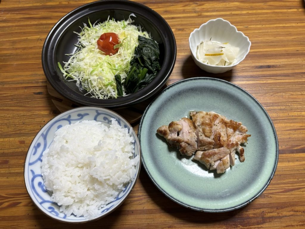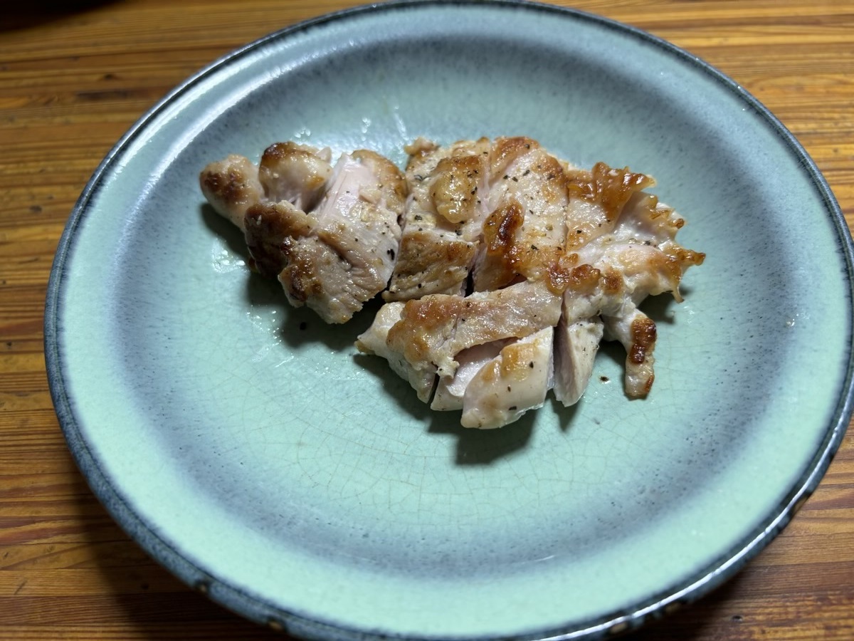今日はシンプルに鳥の塩焼きです。塩コショウで焼きました。肉の両面に約1.0gの塩とコショウ少々を塗り込みます。マイブームの塩分50%カットの天然塩「蒼の極み塩」を使用しました。この前ステーキを焼いたときにすごい味を感じました。いいお肉だったのもあるのですが、肉に塩を直接つけたのがよかったのかも。塩がおいしかったのかも。そう思って鳥肉も同じように塩と胡椒をかけて焼いてみました。