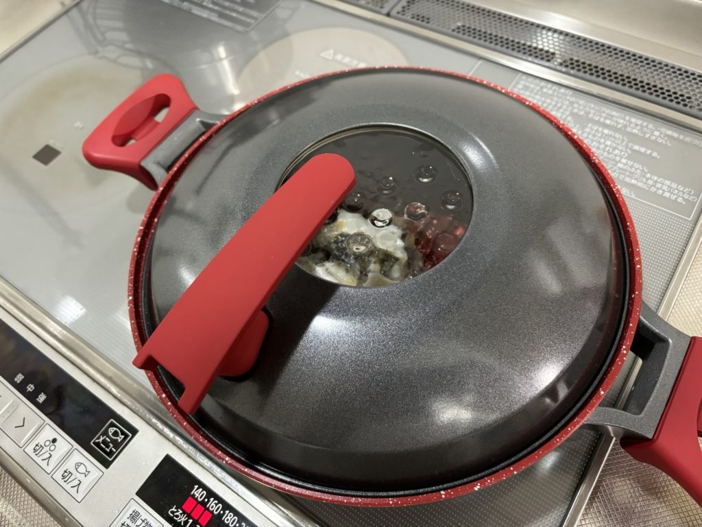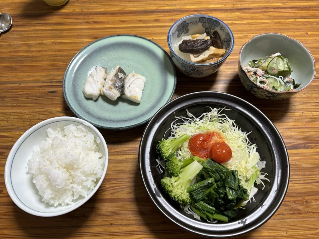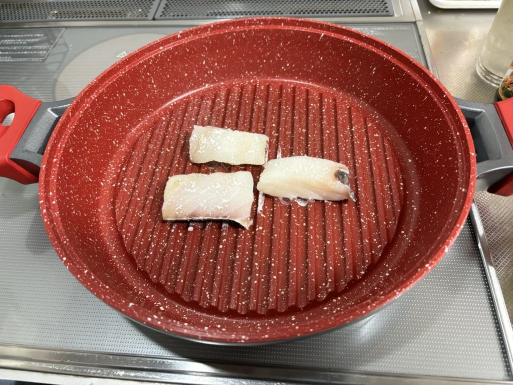 夕食は「たら」を塩焼きにしました。塩はマイブームの塩分50%カット天然塩「蒼の極み塩」を1.0g使用しました。3分の2程の塩をたらの両面に塗り込みます。今回もなみなみフライパンを使用しました。中火で皮側から焼いて焦げたぐらいでひっくり返します。残りの塩をふりかけて、まわりにお酒をかけて蓋をします。弱火で3分で出来上がりました。