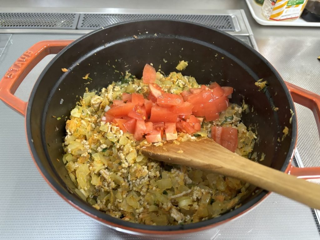 4 ひき肉とトマトを入れてしばらく炒め、ジャワカレー粉末タイプをいれてさらに炒める。