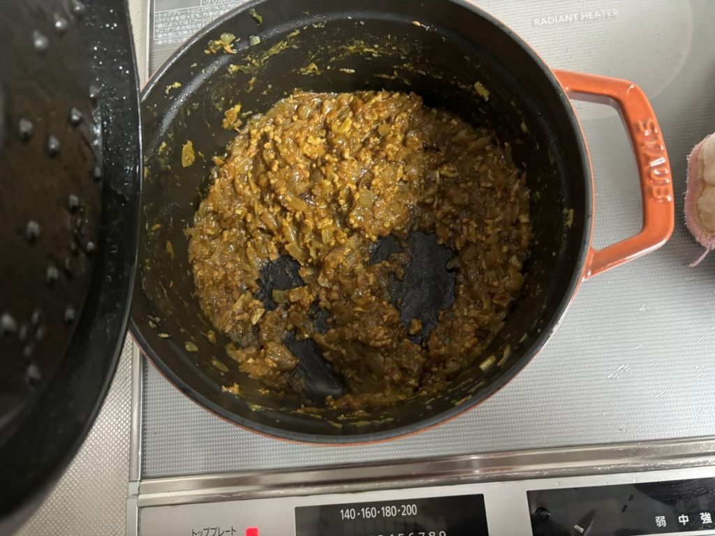 水分量が多くなれば塩分濃度が下がり塩味を感じにくくなります。逆に水分量を少なくして塩分濃度を上げれば、塩味を感じやすくなるのでは?水分量の少ないカレーといえばドライカレー。ドライカレーとは水分を全く加えずに調理する日本発祥のカレーだそうです。試してみる価値はある。そう思って何冊もドライカレーの料理本を読みあさり、香辛料、うまみ足す方法を探して自分なりにつくってみました
