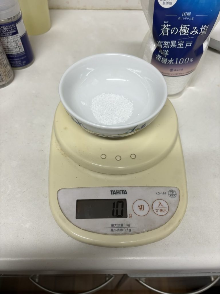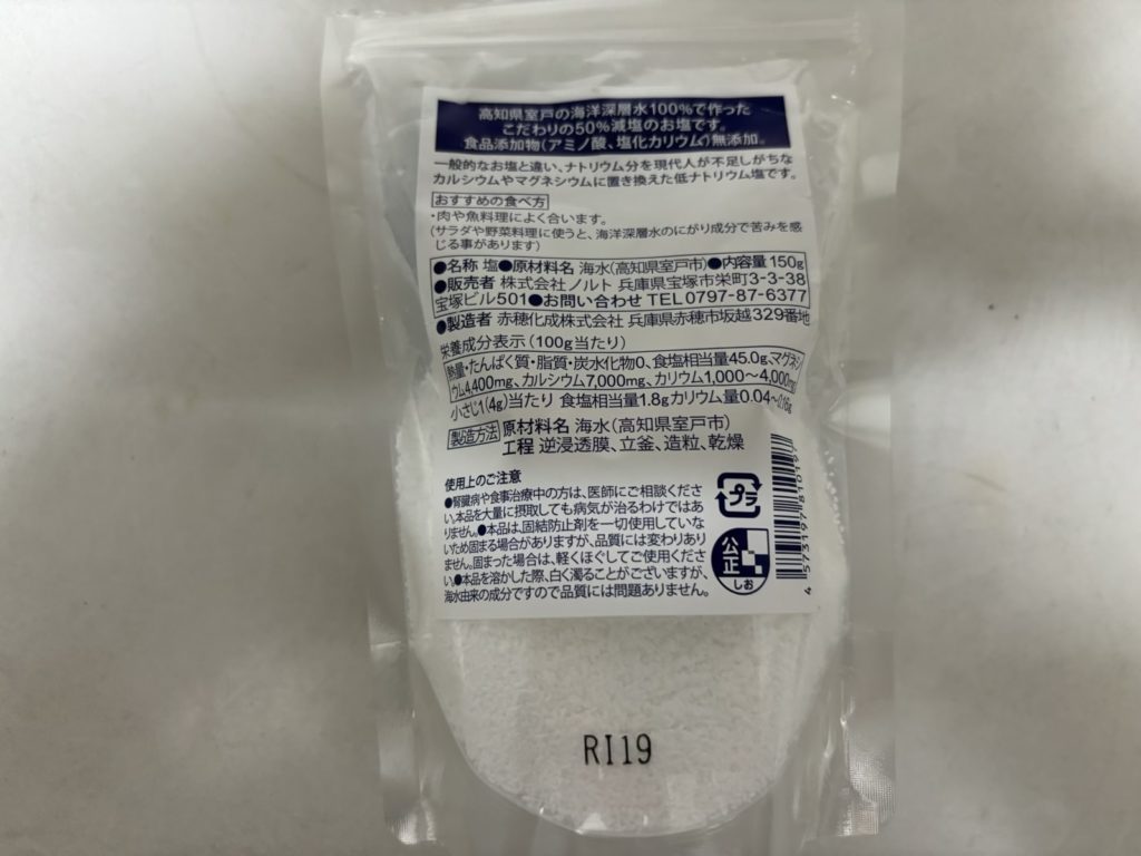 Amazonで購入した50%減塩しお。無塩ドットコムオリジナルの「塩ぬき屋 青の極み塩」です。高知県室戸の海洋深層水100%を使用し、塩化カリウム不使用でありながら、50%減塩してあるそうです。多くのミネラルを含んでいて、化学調味料や合成保存料、着色料は不使用みたいです。原料はすべて国産のものを使っていて、製造も国内の兵庫県赤穂市で行っているそうなので安心ですね。味も美味しかったです。