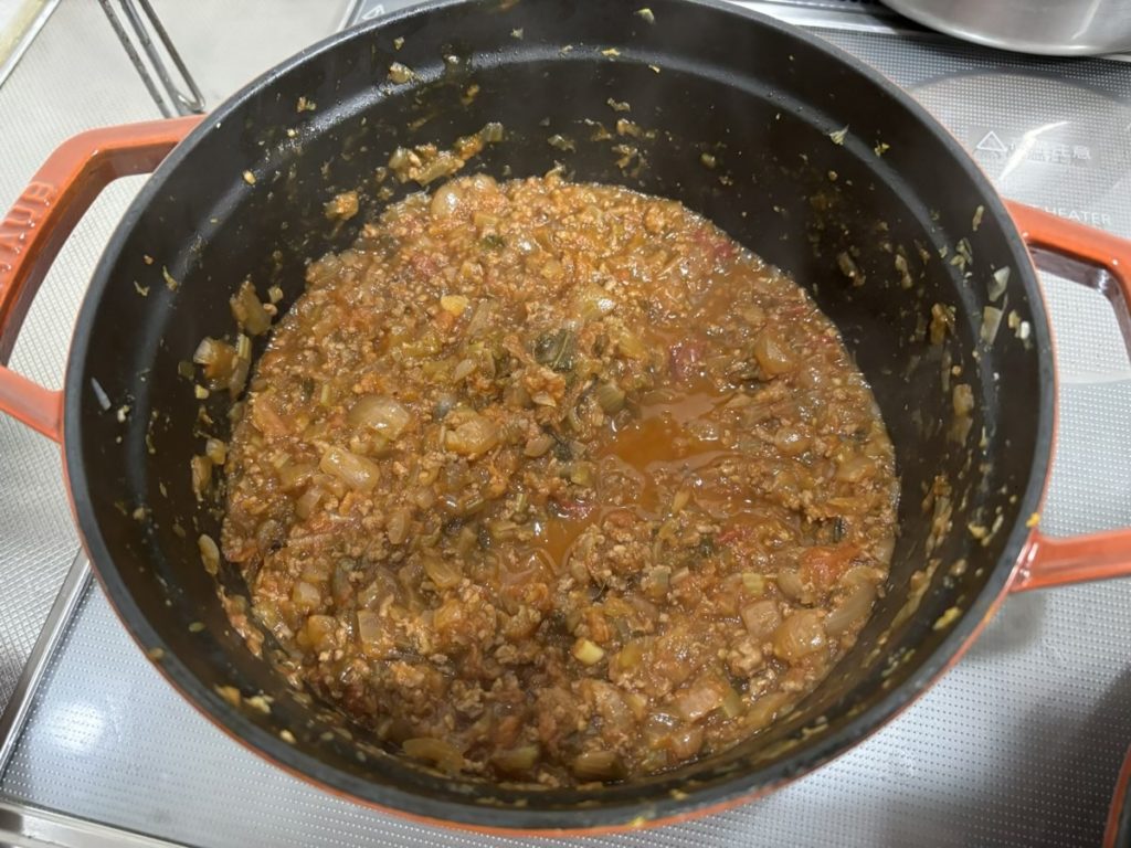 ④ ひき肉とトマト、ホールトマトを入れてしばらく炒める。