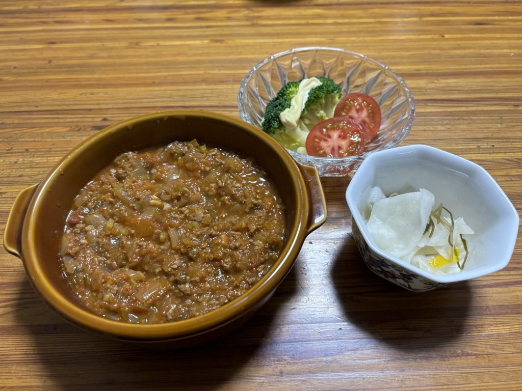 詳しく言えば、牛ひき肉の赤ワイン煮を極力水分カットした物です。味を感じやすくするために鷹の爪とすりおろしたショウガを入れました。ワインとトマトの風味が引き立って、シチューを食べたって満足しました。ドライですが美味しかったです。
