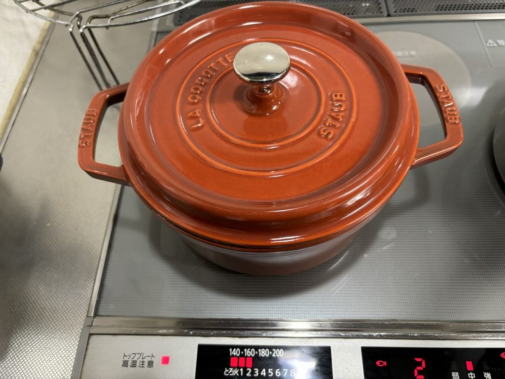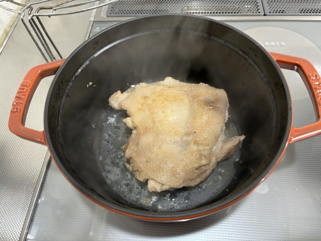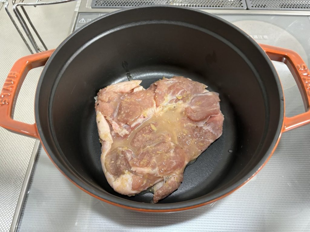 ②STAUB鍋に皮側を下にして鶏もも肉をおく。
