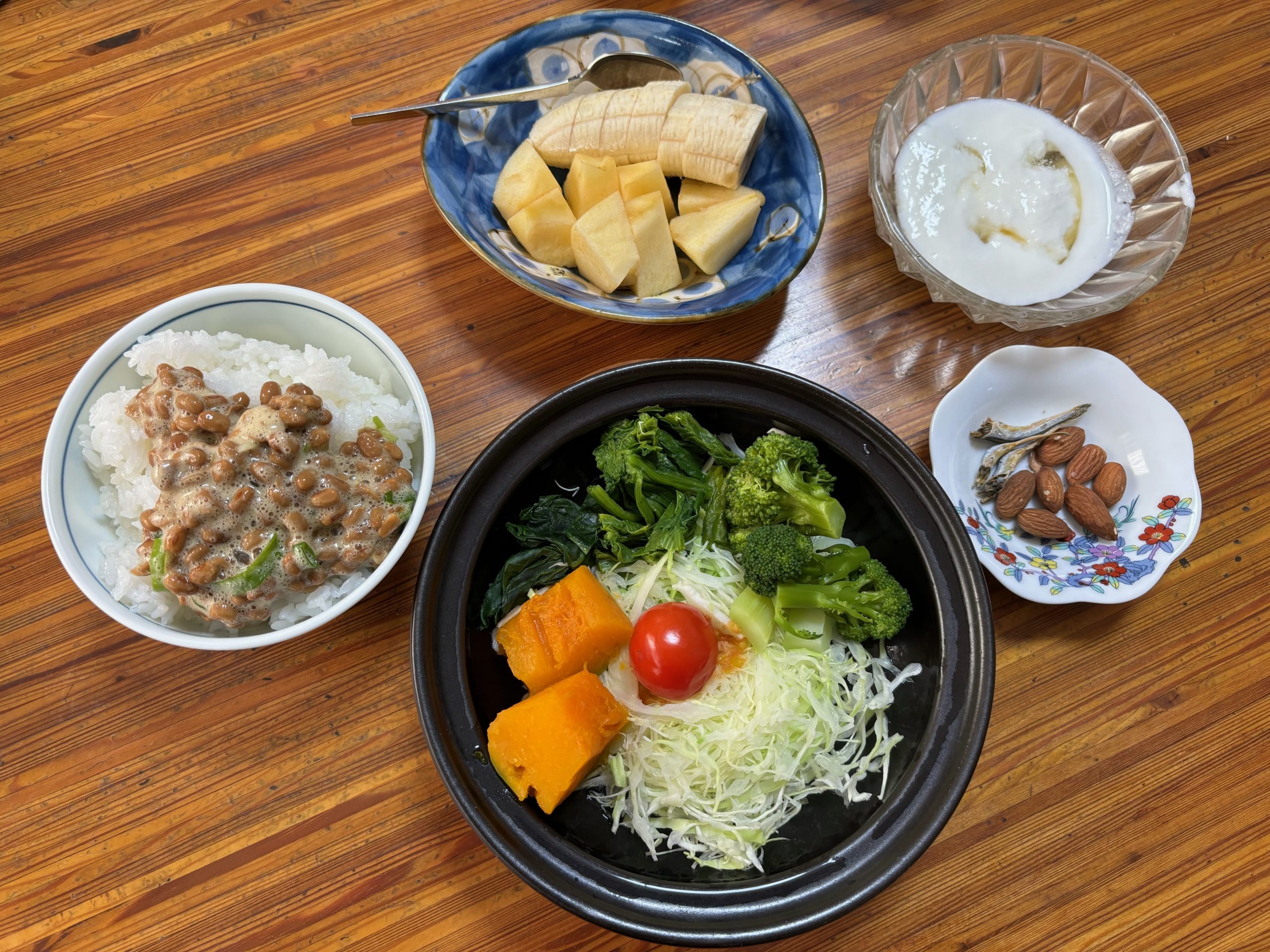 退院してから毎朝食べている朝ごはんです。納豆にご飯と自家製ヨーグルト、フルーツが家の定番メニューでした。野菜も必要かとおもって温野菜に柚子エキスをかけて食べています。焙煎ナッツと煮干しも食べるようになりました。父が毎朝食べていたのでもらってます。朝から贅沢かもしれませんね。
