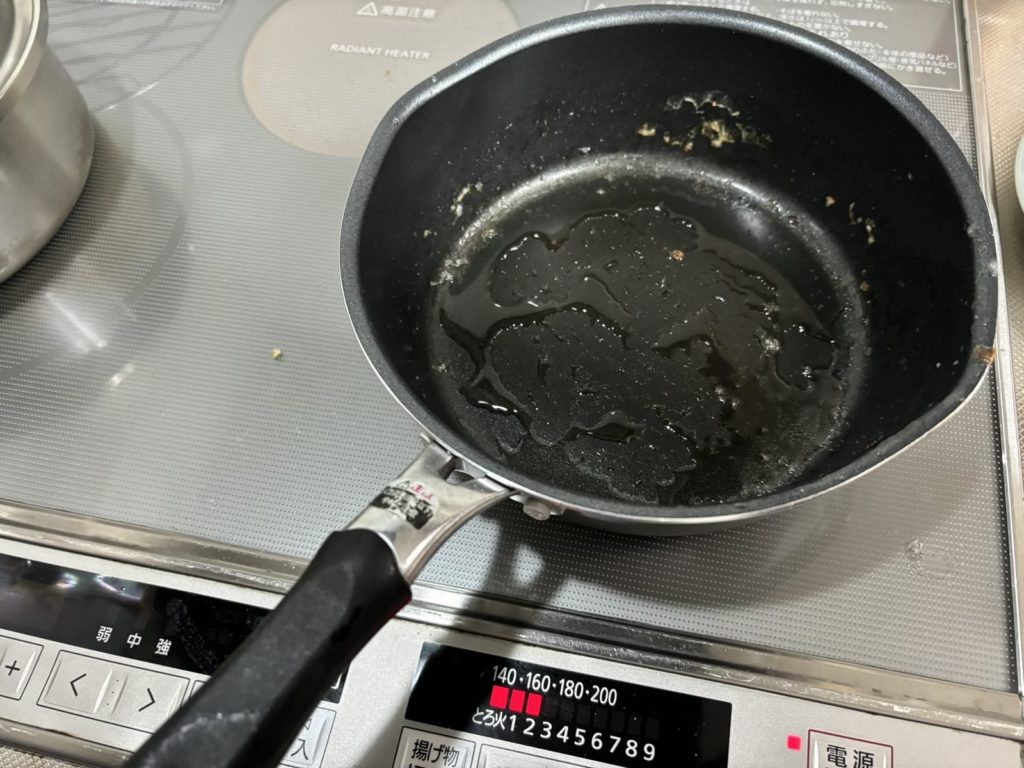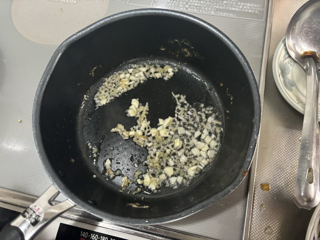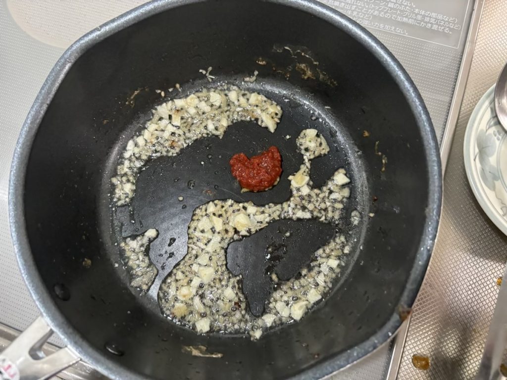⑦そのままフライパンにオリーブオイルを足して生姜、にんにくを弱火で炒める。豆板醬を投入する。