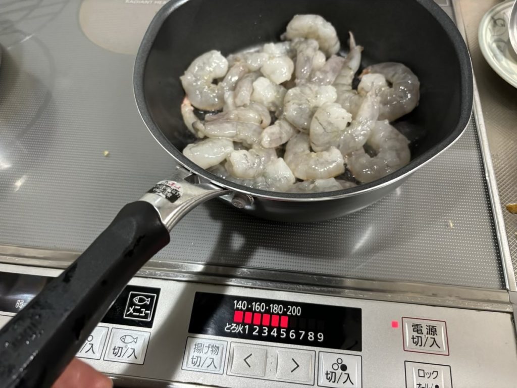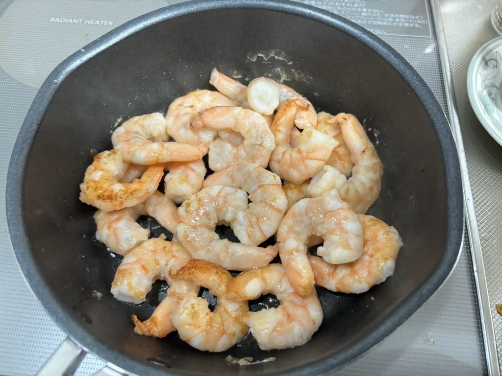 ⑤フライパンにエビを中火で炒める。