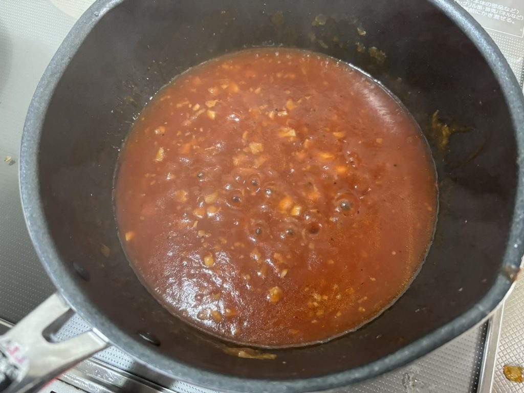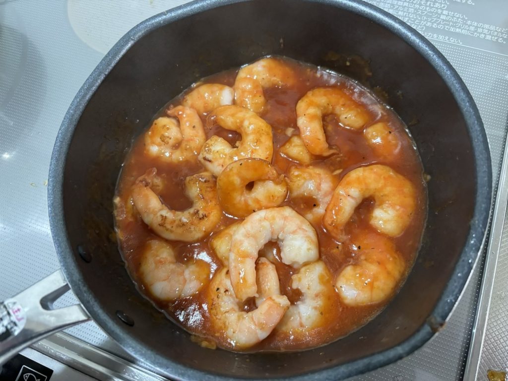 ⑧合わせ調味料を投入して中火にする。沸騰したらエビを投入する。