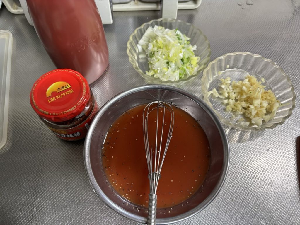 ③合わせ調味料を作る。ボールなどにトマトケチャップ、酒、片栗粉、濃口醬油、胡椒、水を混ぜ合わせる。