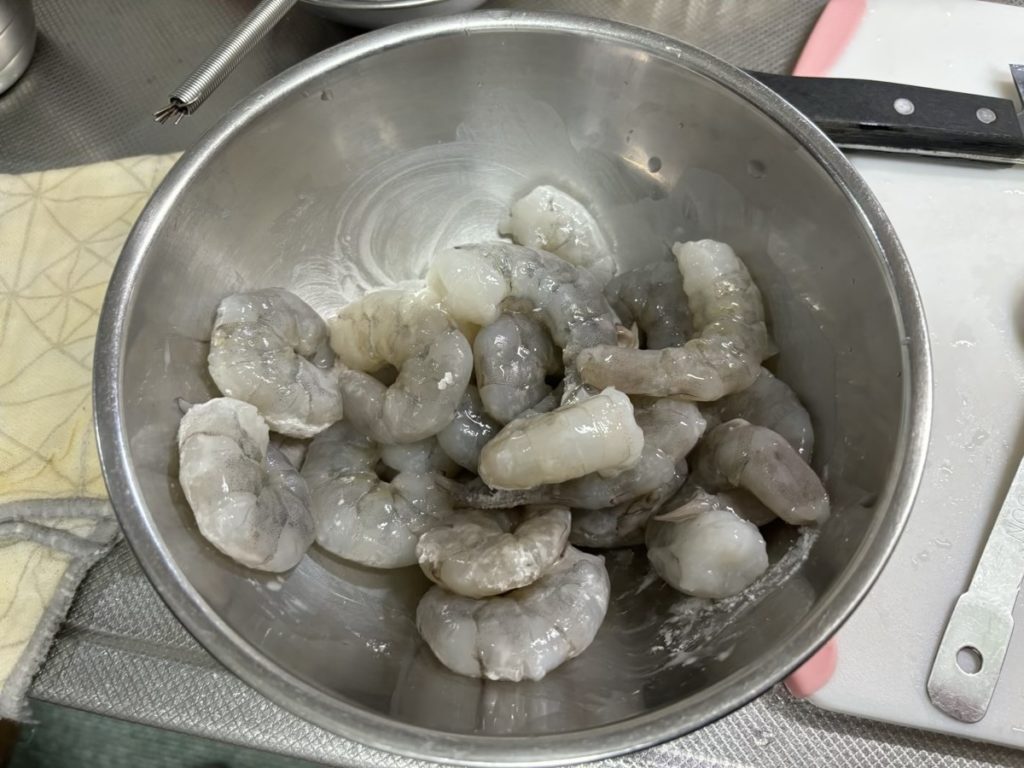 ①むきエビの背ワタを取り、片栗粉小さじ1杯をまぶしてよくもんでから水で洗って汚れを落とす。ペーパータオルで水けを拭きとる。