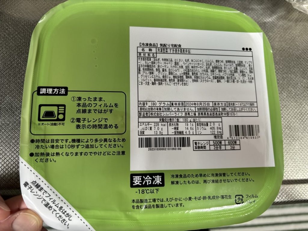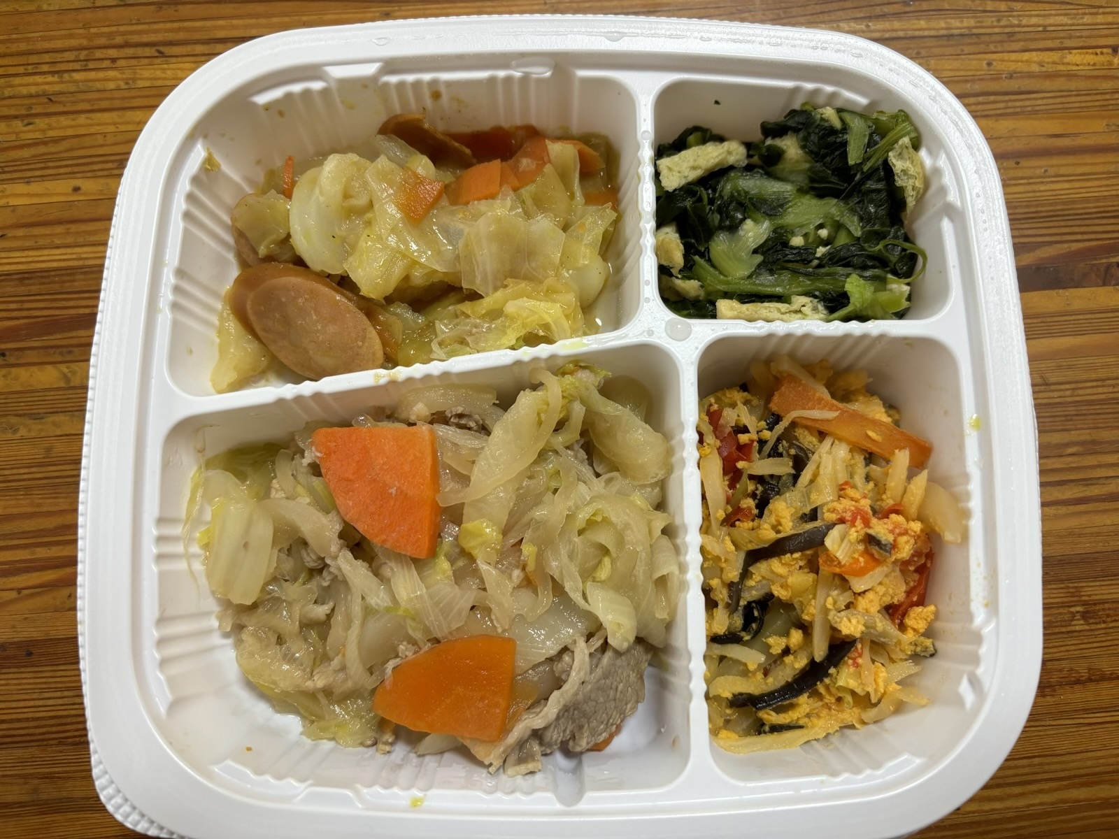 すき焼き風煮の主菜が1品、副菜3品が詰め込んであります。主菜はすき焼き風の甘辛煮で牛肉の味もしっかりしていました。種類によってはぼんやりしている弁当もあるのですが今回は主菜も副菜も美味しかったと思います。