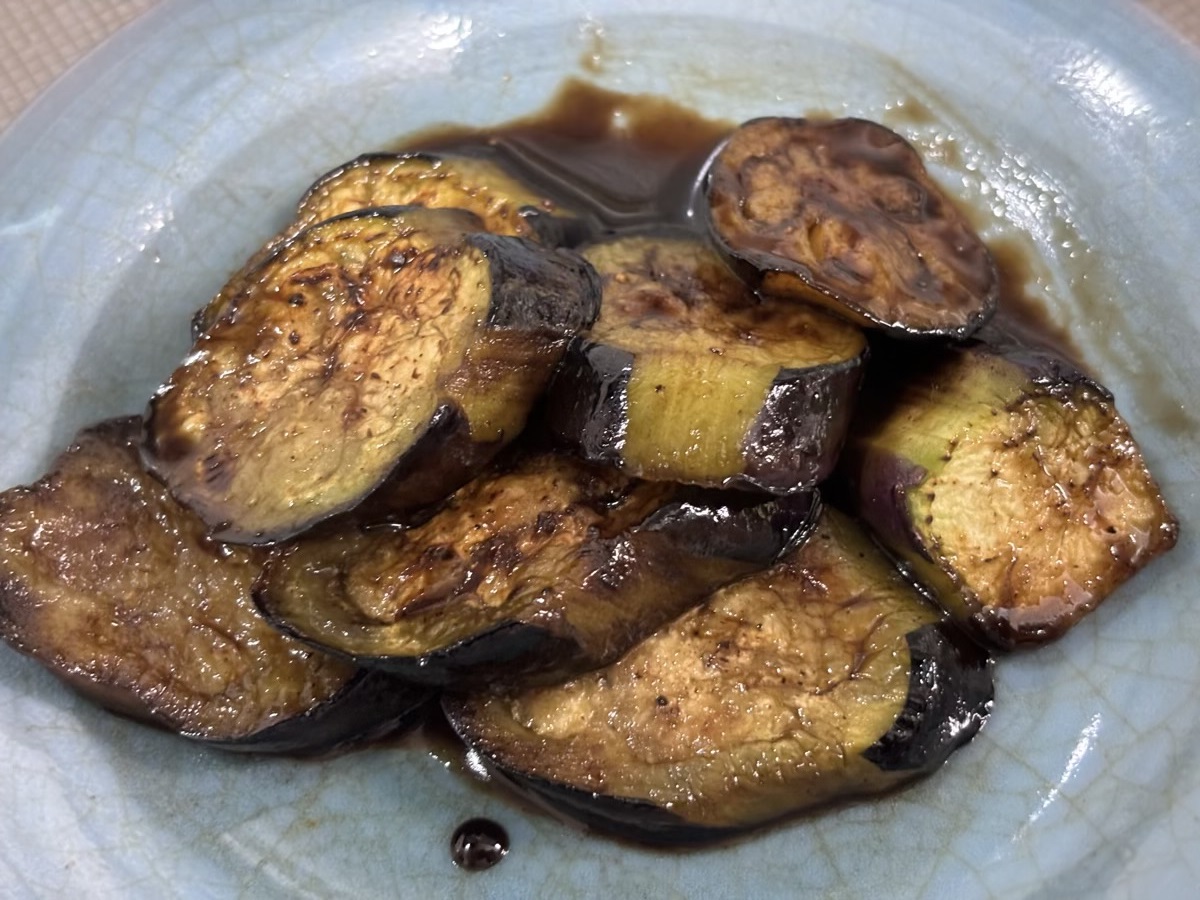 夕食の副菜に茄子の甘酢焼き。醬油にバルサミコ酢ときび砂糖、酒、みりんをあわせました。油をすった茄子が甘辛ソースによく合っていました。ごはんがすすむ。簡単ですが美味しい。定番減塩料理になりそうです。