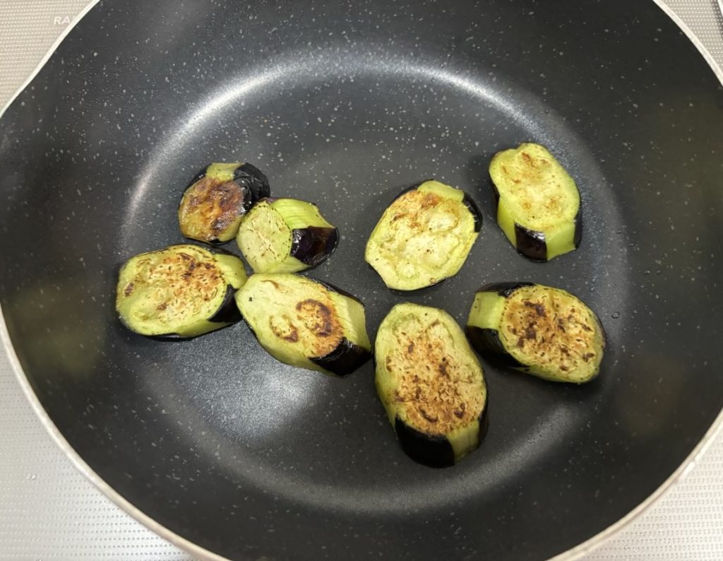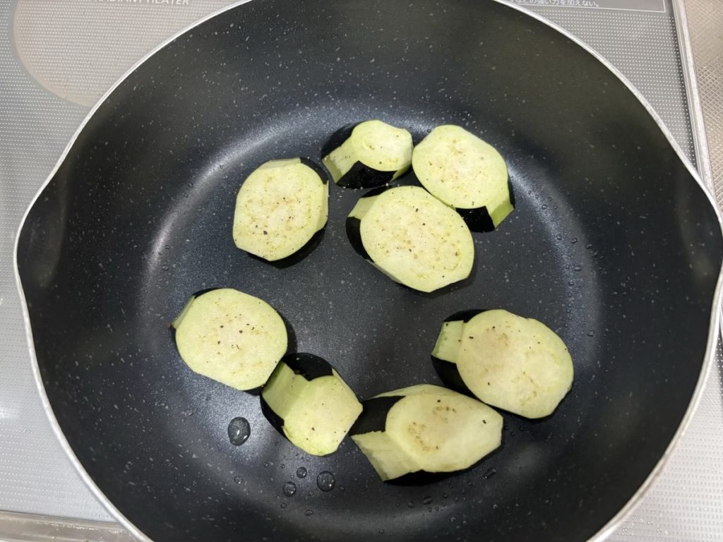 ②フライパンにオリーブオイルをひき中火で熱し茄子を並べる両面に焼き色を付ける。
