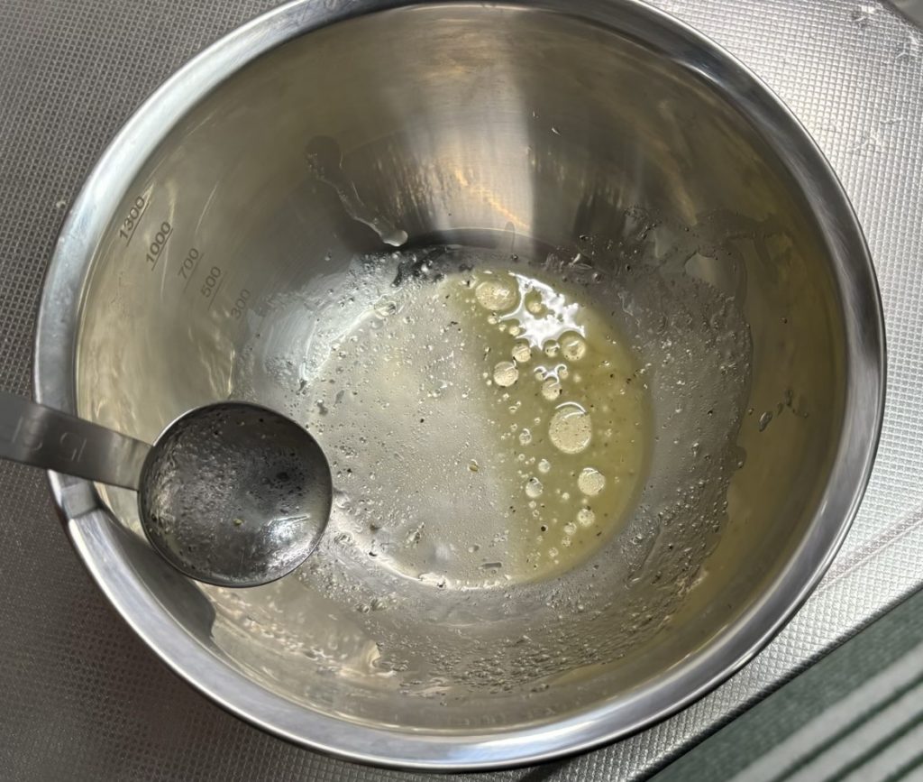 ②ボウルに白バルサミコ酢、オリーブオイル、胡椒をあわせてドレッシングを作る。