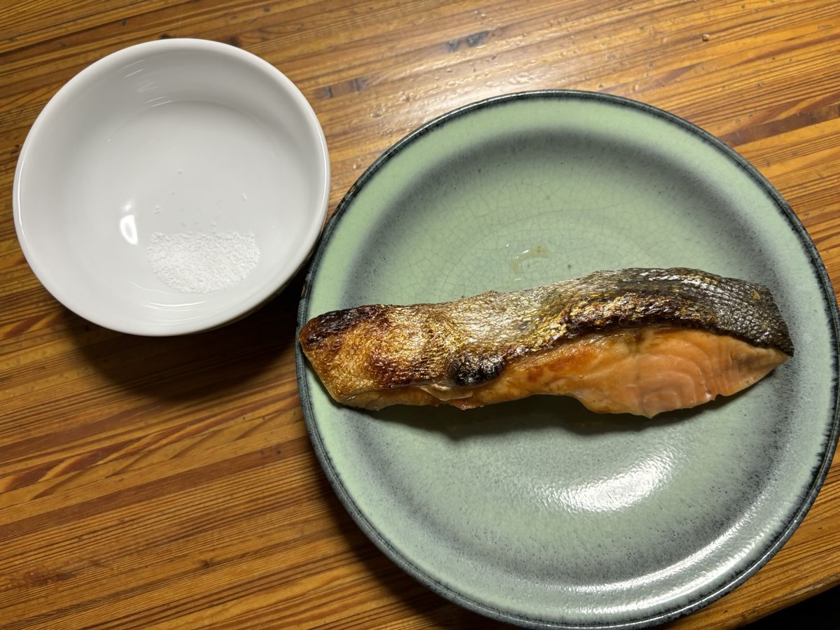 今日の夕食は無塩鮭を魚焼きグリルで焼いて塩を別小皿に入れて後付けで食べました。後付けの方が塩がまとめて舌に直撃します。すごく塩味を感じます。シンプルで美味しい。