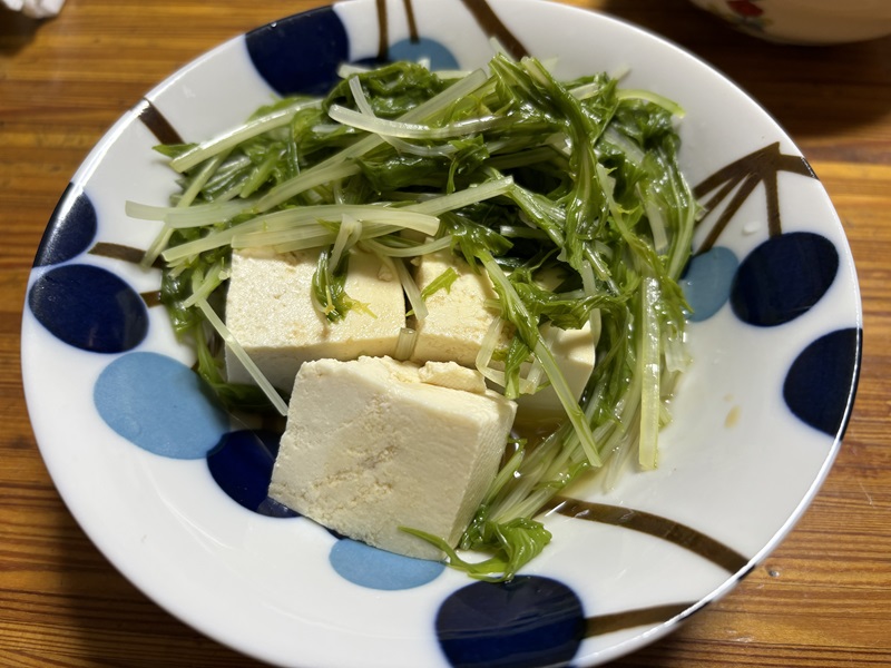 夕食の副菜の湯豆腐です。昆布だしベースで豆腐と水菜を茹でています。
