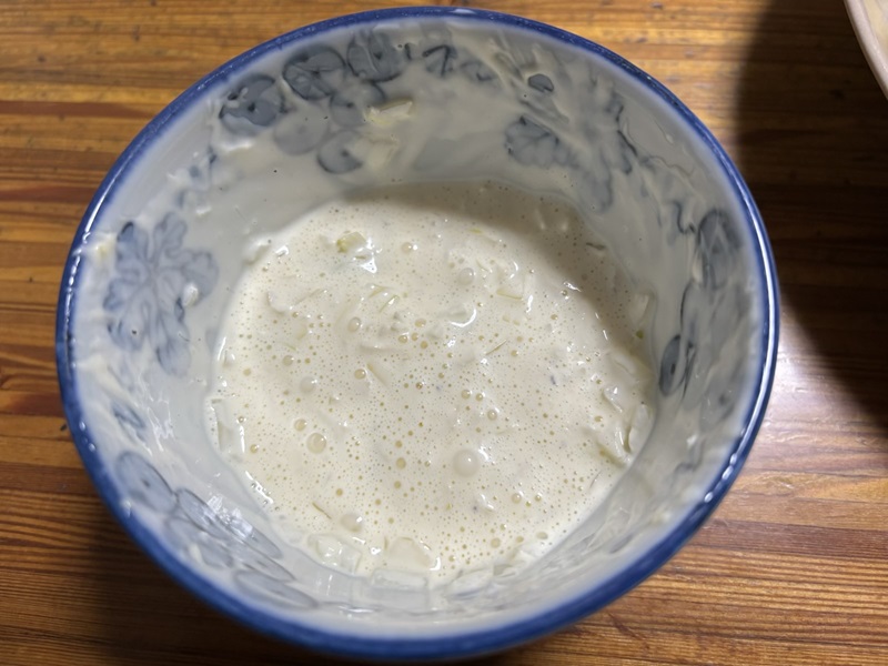 タルタルソースは玉葱1/4個をみじん切りにして、白バルサミコ酢小さじ1杯とマヨネーズ大さじ3杯、砂糖と胡椒を少々混ぜ合わせました。