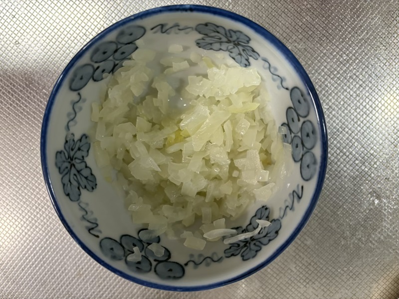 ①玉葱をみじん切りにして容器に入れサランラップを軽くかけて500Wで2分程レンチンして冷まします。