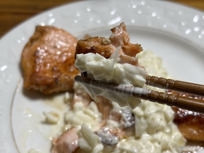 美味しい!!玉葱をレンチンしたので辛みが和らいでいます。白バルサミコ酢とマヨネーズもいい感じで混ざっています。ご飯がすすみます。