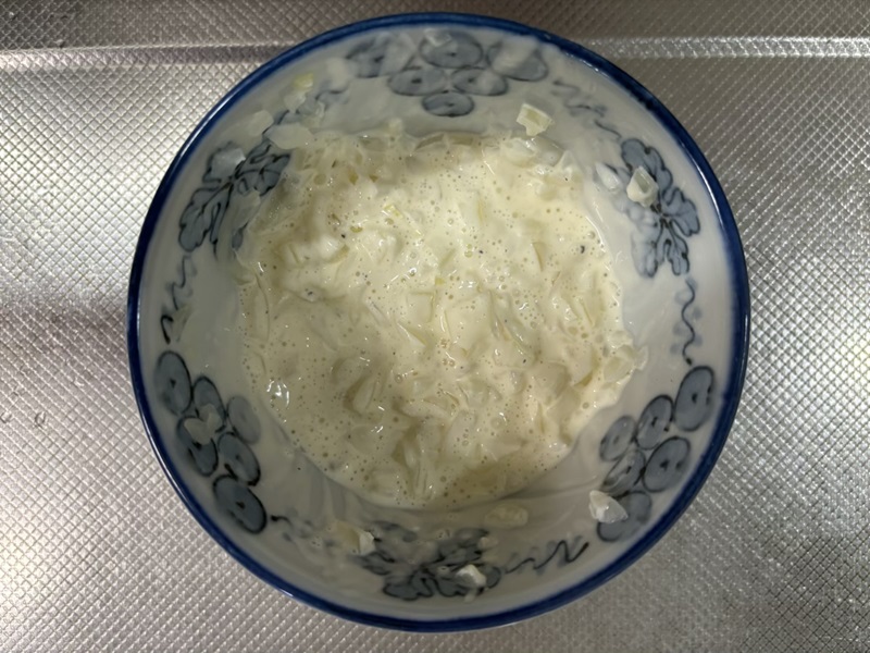 ②玉葱が冷めたら、白バルサミコ酢とマヨネーズを合わせて胡椒を少々かけて混ぜます。鮭を焼く工程の隙をみつけて行ってください。