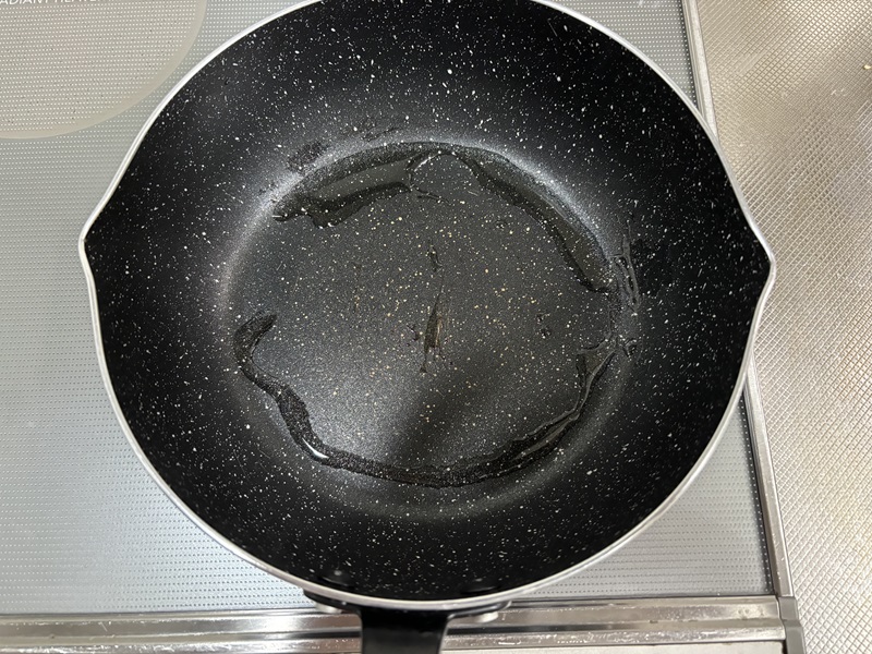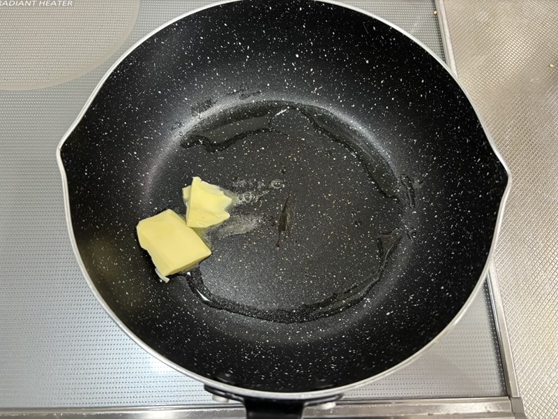 ④フライパンにオリーブオイルをいれて中弱火で熱し、バターをいれる。
