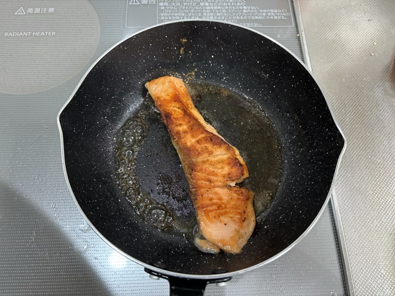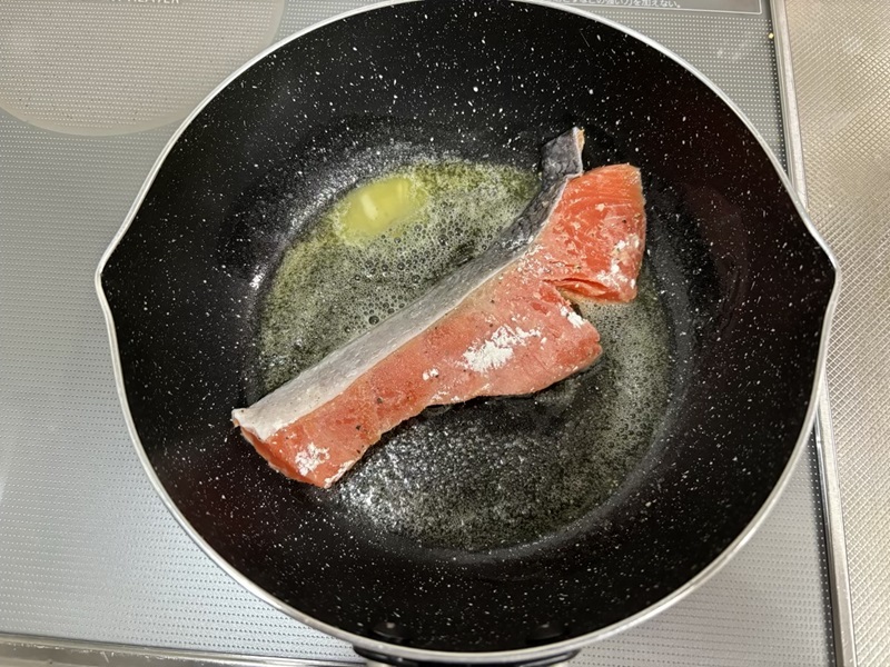 ⑤無塩鮭を入れる。焼き色がつくまで2~3分焼いてひっくり返す。