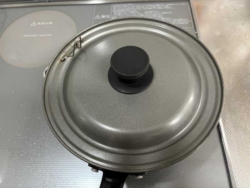 ⑥弱火にして白ワインをまわしかけて蓋をして5~6分蒸し焼きにする。