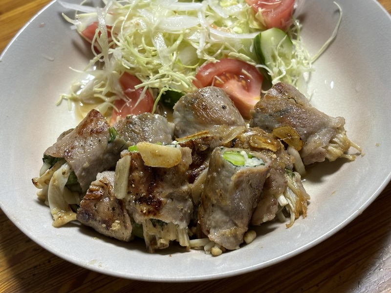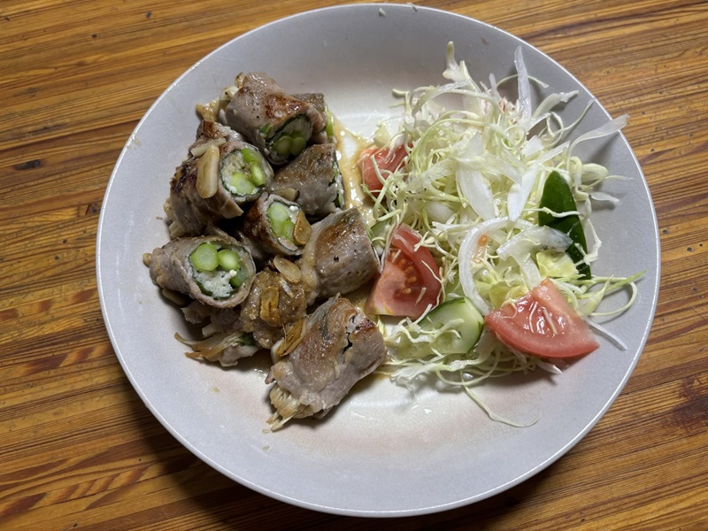 今日の夕食は母手製のアスパラとエノキの豚肩ロース肉巻きです。今回の味付けは減塩50%しお2gで食塩相当量は1gです。酒、みりんを大さじ1杯づついれてにんにくと生姜で風味をだします。