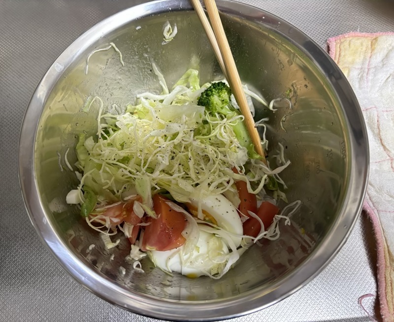 白バルサミコ酢とオリーブオイルとハチミツと柚子エキスを小さじ1ずつボールに入れて、野菜とあえて胡椒少々。