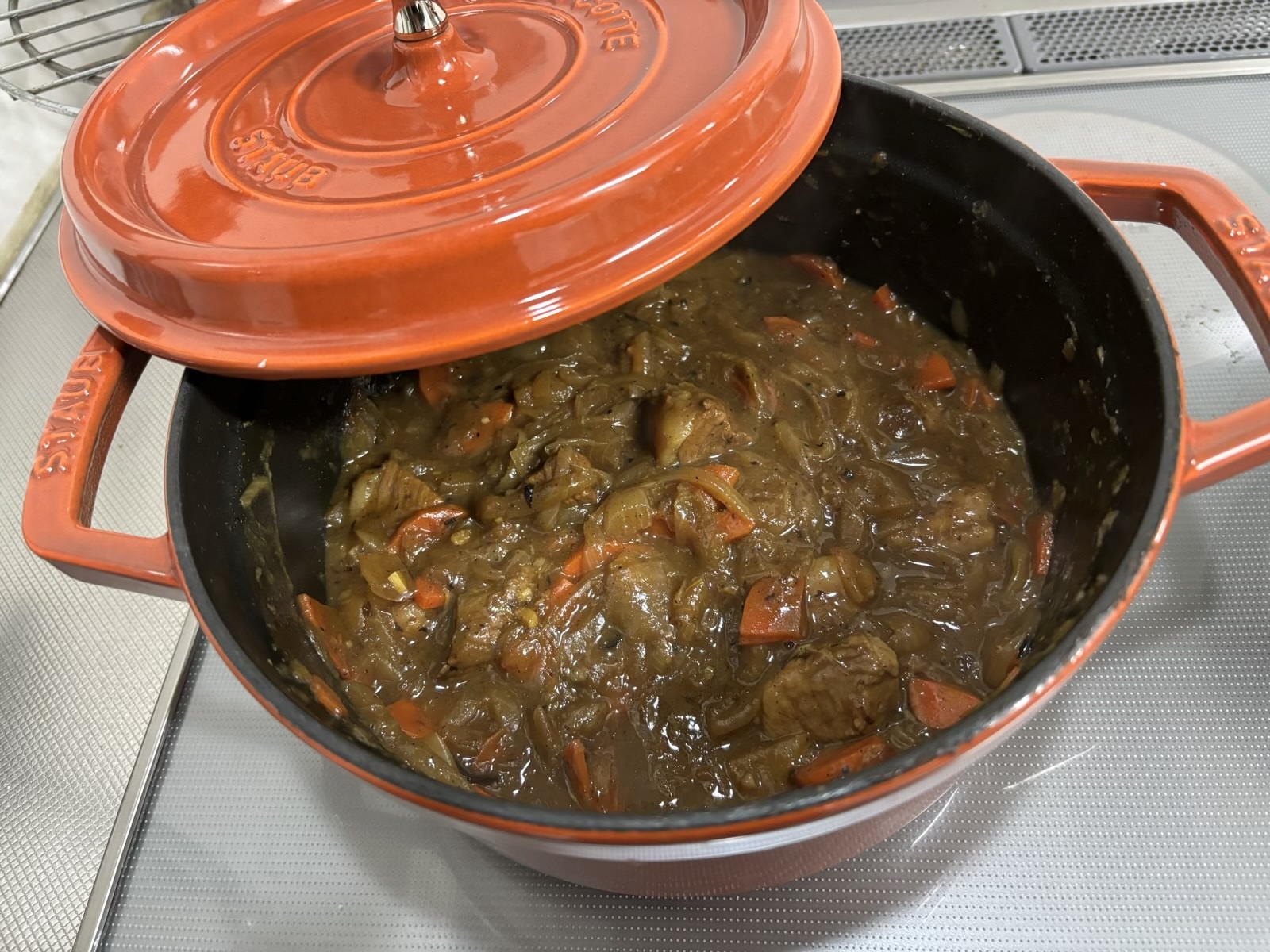 ストウブ鍋に油をひいて、ニンニクと粉のルーを炒めて香りが立ってきたら玉ねぎを入れるのですが、ルーがこげてきて玉ねぎも色がつくのでわかりにくく焦りました。玉ねぎがしなってきたら、ニンジン、リンゴ、お肉を鍋に入れて適当にかきまぜて蓋をします。この時中火です。蓋の隙間から湯気が出てきたら極弱火にして30分待ちます。この極弱火がストウブ鍋の調理のコツみたいです。30分たったら蓋を開けてひと混ぜしてふたたび蓋をしめ火を切ってさえるまで待ちます。だいたい3時間ほどでしょうか。さめたら蓋を開け、すりおろしたジャガイモをいれて中火で沸騰させます。沸騰したら弱火にして5分ほどしたら出来上がりです。仕上げに塩分50%カットの天然塩「蒼の極み塩」を1gほど入れました。これで1皿約1.7gになります。香料のコショウとガラムマサラを足して隠し味にインスタントコーヒーをすこしいれてみました。