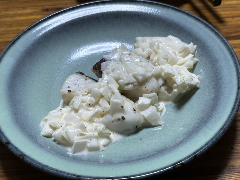 鱈を魚焼きグリルで焼き、その上にタルタルソースをかけました。